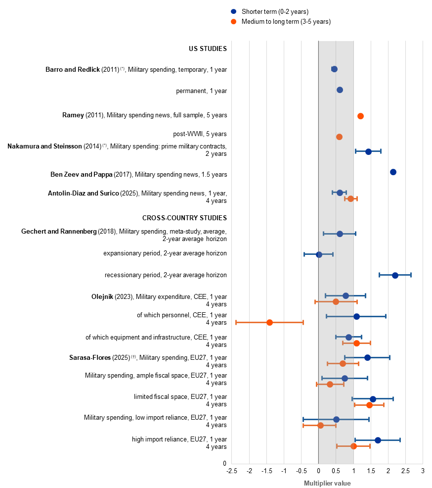 Notes: The dot represents the (main) estimate of the cumulative defence spending multiplier and the bands indicate one standard deviation when available or readily calculated. When multiple results were available, the selection was made based on the original author’s preferred specification to ensure a relevant comparison to the other studies, and for a one and four-year horizon (centre of the shorter and medium to long-term horizons respectively).