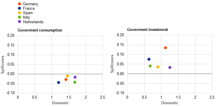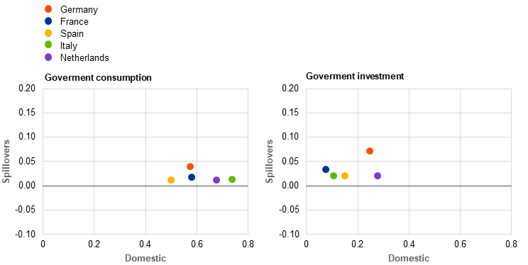 Notes: The x-axis shows the impact on the country where the shock occurs and the y-axis shows the spillover on the remaining big five economies (Germany, Spain, France, Italy and the Netherlands). For example, for government consumption in panel a), the dark blue dot shows that an increase in government consumption in France increases French real GDP by 1.2% and leads to a negative spillover of -0.04% on the rest of the big five economies.