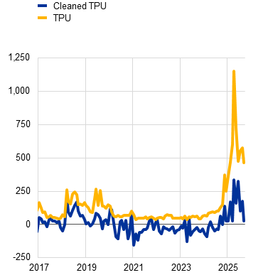 Trade policy uncertainty has risen significantly in the face of higher tariffs and tariff threats, adding a new layer of complexity to assessing the global economic outlook. Shifts in tariff and trade policy, unpredictable communication and the move away from rules-based multilateralism towards bilateral leverage have heightened uncertainty for firms and investors. This has influenced sourcing, production and investment decisions, and may weigh on trade dynamics, investment and overall macroeconomic performance. Moreover, uncertainty can affect expectations and dampen activity even in the absence of concrete policy changes. Monitoring it has therefore become crucial to assessing the economic outlook. Trade policy uncertainty has been an important part of the technical assumptions underlying recent rounds of the Eurosystem/ECB staff macroeconomic projections for the euro area.[1]