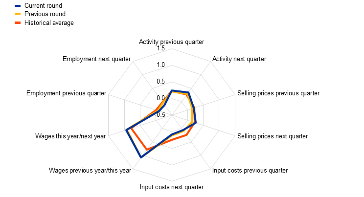Notes: The scores reflect the average of scores given by ECB staff in their assessment of what contacts said about quarter-on-quarter developments in activity (sales, production and orders), input costs (material, energy, transport, etc.) and selling prices, and about year-on-year wage developments. Scores range from -2 (significant decrease) to +2 (significant increase). A score of 0 would mean no change. For the current round, previous quarter and next quarter refer to the fourth quarter of 2025 and first quarter of 2026 respectively, while for the previous round these refer to the third and fourth quarters of 2025. Discussions with contacts in January and in March/April regarding wage developments normally focus on the outlook for the current year compared with the previous year, while discussions in June/July and September/October focus on the outlook for the next year compared with the current year. The historical average is an average of scores compiled using summaries of past contacts extending back to 2008.