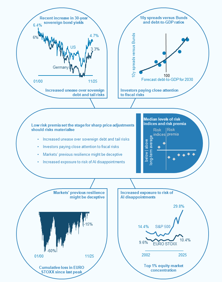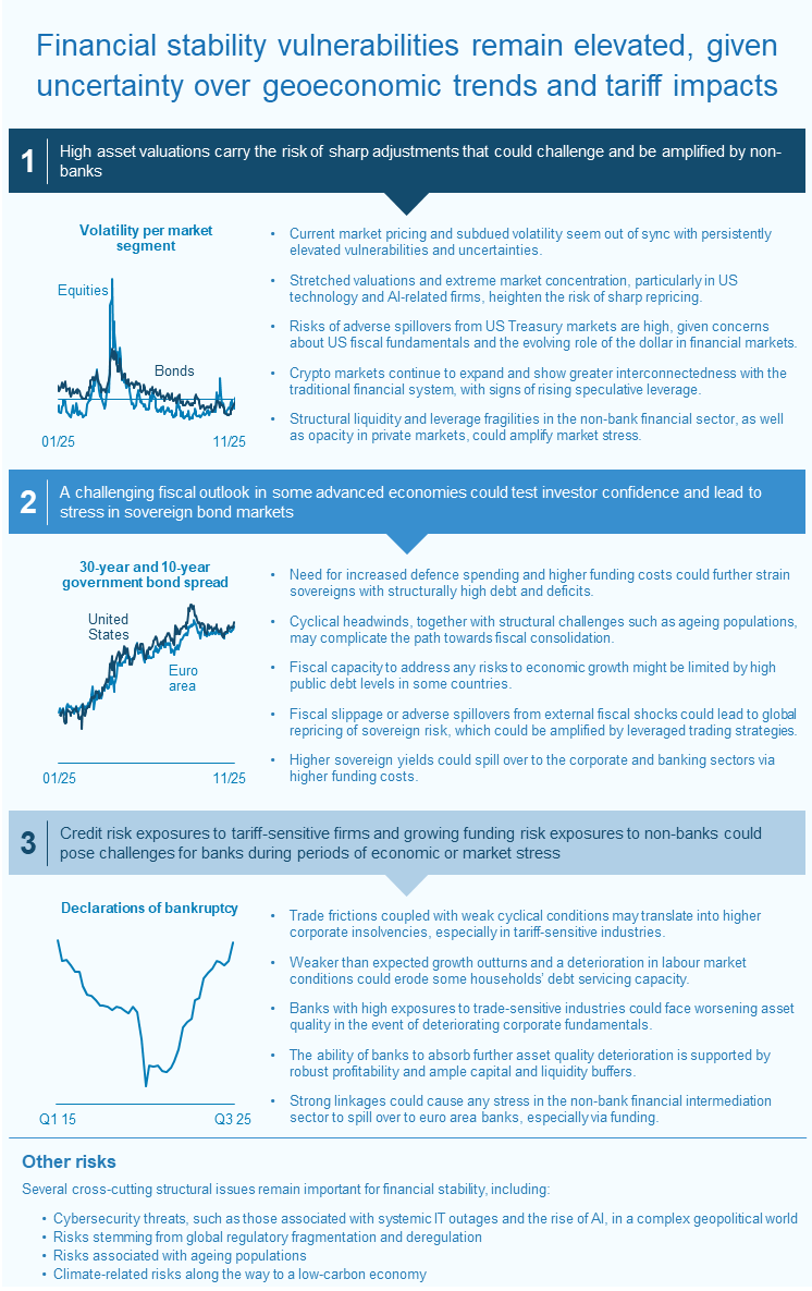 In this context, three main sources of risk and vulnerability emerge as central to euro area financial stability. First, stretched valuations in increasingly concentrated asset markets raise the risk of sharp, correlated price adjustments. Should they occur, such sudden market drawdowns could pose balance sheet challenges for euro area non-banks, given their persistent liquidity and leverage vulnerabilities, increasing the risk of fire sales which could amplify market stress. Opaque private markets could also be a source or amplifier of market downturns. Second, fiscal challenges in some advanced economies could test investor confidence, possibly triggering stress in sovereign bond markets. Third, although banks have demonstrated resilience to recent shocks, credit risk exposures to the tariff-sensitive segment of the corporate sector could yet undermine the performance of bank loans, while growing interlinkages with non-banks could expose bank funding vulnerabilities in stressed market conditions. The potential for these vulnerabilities to materialise simultaneously given common triggers, possibly amplifying each other further, increases the risks to euro area financial stability.