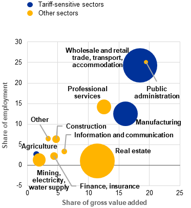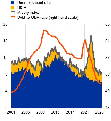 a) Share in euro area employment, gross value added and credit, by sector and tariff sensitivity | b) Misery index and household indebtedness in the euro area |