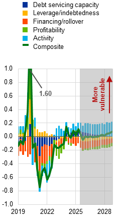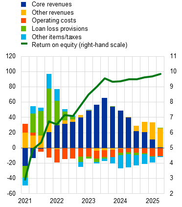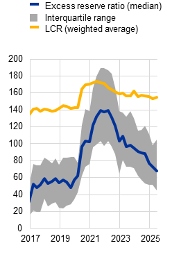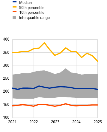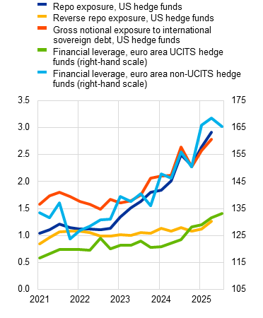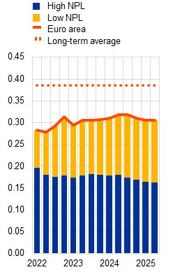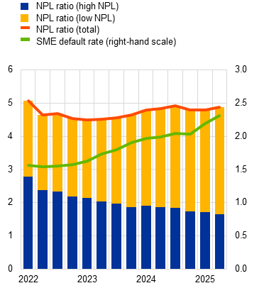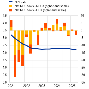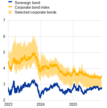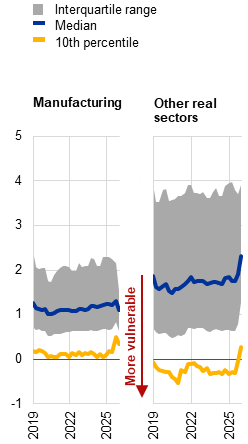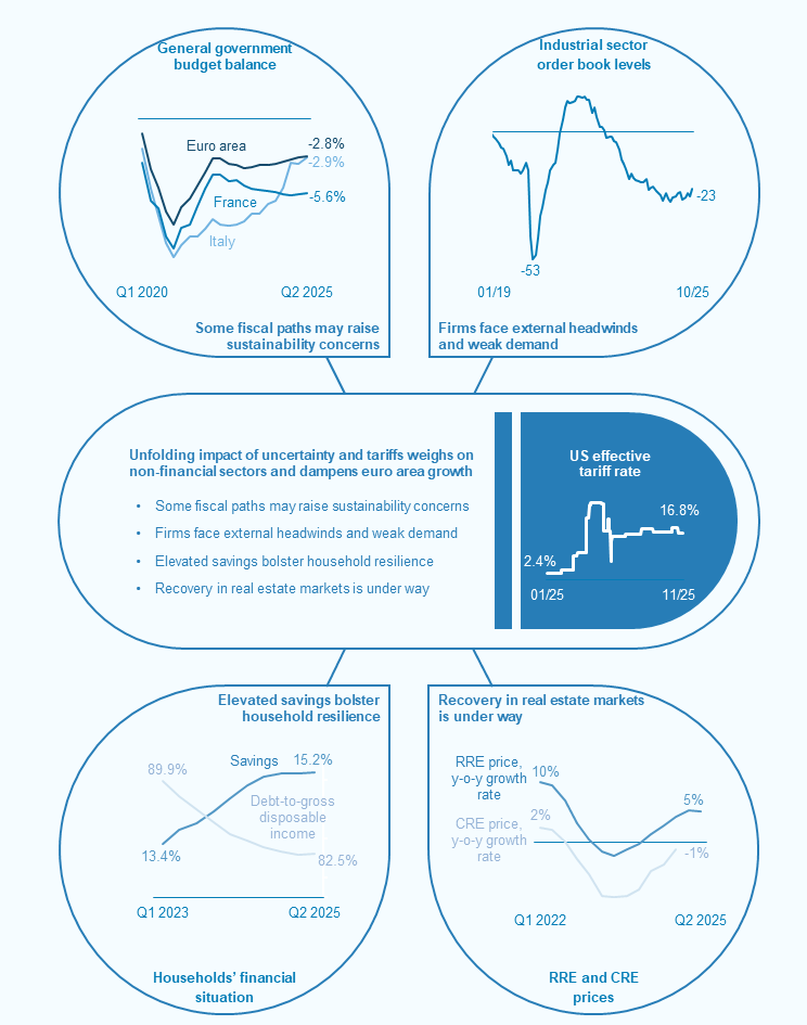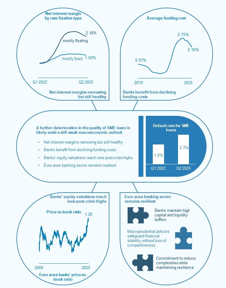 At the same time, fiscal fundamentals in some euro area countries have been persistently weak. Fiscal slippage could test investor confidence, especially in countries where political majorities are fragile. A repricing of sovereign risk would be more difficult to absorb today than previously due to a gradual shift in the investor base towards more price-sensitive investors. That said, financial markets have so far accommodated high levels of issuance smoothly, including in more turbulent periods. In addition, the banking system has shown resilience to recent shocks, underpinned by strong capital, liquidity and profitability positions. Yet rising credit risk among tariff-sensitive firms could undermine the performance of bank loans, while growing interlinkages with non-banks could expose bank funding vulnerabilities in stressed market conditions.