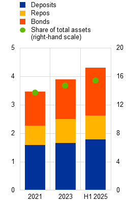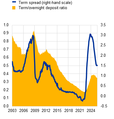 Between 2008 and 2025, the share of household and NFC overnight deposits in banks’ total funding rose from about 11% to 24% (source: ECB (BSI)). Three factors contributed to this development: (i) the financial assets of the non-financial private sector grew more than those of the financial sector, (ii) households and NFCs shifted their assets away from bonds towards deposits, and (iii) term deposits were substituted with overnight deposits (source: Eurostat).