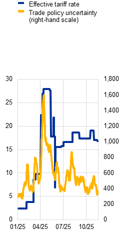 Lingering global uncertainties are posing risks to the growth outlook in the euro area, with trade tensions among the key factors. Tariffs on euro area exports to the United States have increased considerably since the start of the year. The recent US-EU agreement has capped tariffs for most goods, resulting in a notable decline in trade policy uncertainty. That said, it remains elevated by historical standards and renewed spikes cannot be ruled out (Chart 1.1, panel a).[1],[2] Persistent uncertainty about the longer-term impact of higher tariffs is continuing to weigh on global activity, adding to downside risks for growth in the euro area. Exporters in particular are facing a challenging environment as subdued external demand and intensified competition from abroad erode growth prospects. Beyond its impact on direct trade flows, heightened uncertainty may also be weighing on firms’ investment plans and hiring decisions.[3] This is dampening activity in those sectors closely integrated into global value chains, with knock-on effects on consumer confidence.