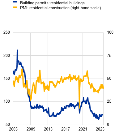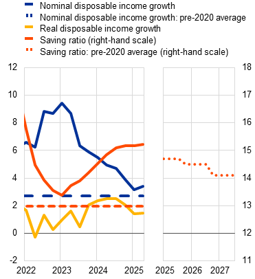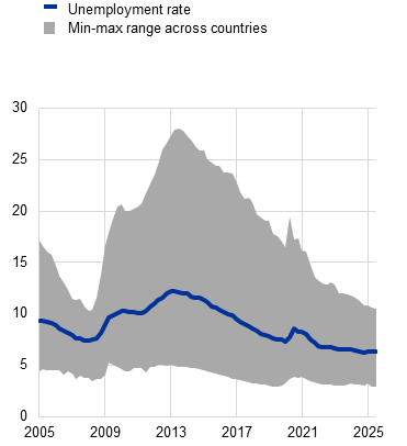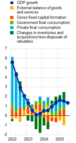 Looking ahead, the macroeconomic outlook for the euro area is balancing pockets of resilience against sustained challenges. While factors such as moderating inflation, a strong labour market and accumulated household savings provide the conditions for a gradual recovery in private consumption, the external environment is set to remain difficult. US tariffs, an appreciating euro and rising import competition from China are likely to continue to weigh on export-oriented sectors, particularly manufacturing (see Section 1.3). Investment is also expected to remain subdued as firms face weaker profitability and heightened uncertainty. Overall, growth is projected to recover only gradually.[6] A sharper deterioration in global trade conditions, stronger currency appreciation or other shocks that could prolong a persistent weakness in consumer confidence could materially weigh on the recovery, underscoring the fragile nature of the current outlook.