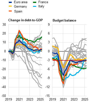 Fiscal fundamentals are on greatly differing trajectories across countries and remain particularly weak in some. While many euro area countries have made substantial progress on fiscal consolidation since the pandemic, some have not materially reduced their debt levels from the pandemic-era peaks and are still running sizeable budget deficits (Chart 1.3, panel a). This is less of a problem for countries that still have low or medium-sized levels of debt. For more highly indebted euro area countries, however, such a trajectory for fiscal fundamentals could raise debt sustainability concerns among investors, especially where consolidation efforts are complicated by small or unstable parliamentary majorities. Furthermore, the Next Generation EU programme finishes at the end of 2026, and there is a risk that substantial amounts of available funds will not be disbursed to Member States in time.[7] If additional flexibility is applied to speed up disbursement, it will still be important to ensure that funded projects and structural reforms are of appropriate quality. Overall, euro area deficits are expected to increase in the coming years.[8]