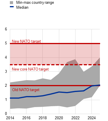 Planned defence spending and persistent structural challenges may strain sovereign balance sheets in the medium term. Elevated geopolitical tensions and hybrid threats highlight the urgency of increasing defence spending to meet the new NATO target of 5% of GDP by 2035. Most euro area countries currently fall substantially short of this figure and limited fiscal space may make it hard for some to reach it (see Section 1.2). Necessary defence spending could unlock positive growth effects if well targeted. It may, however, further limit the fiscal space needed to shelter the economy from future adverse shocks and to address structural challenges associated with digitalisation, low productivity, population ageing and climate change. As such, there have so far been few concrete pledges to greatly increase defence spending.