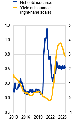 Note: Panel a: spreads are shown as monthly averages. The latest observations are for 18 November 2025. Panel c: the chart shows 12-month moving sums for debt issuance and 12-month moving averages for the yield at issuance.