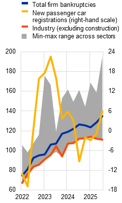 As insolvency regimes differ across countries, the lead-lag relationship between bankruptcies and NPLs can reverse (i.e. NPLs may precede bankruptcies). Moreover, while rising bankruptcies may signal stress, they can also boost medium to long-term productivity by reallocating resources to more efficient firms. Nonetheless, bankruptcies serve as a proxy for the state of the economy and should ultimately be reflected in bank balance sheets.