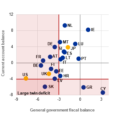 Notes: Panel b: balances are calculated as a three-year average of the forecasts for 2025, 2026 and 2027. The vertical red line marks the 3% of GDP budget deficit threshold set in the Maastricht Treaty. The horizontal red line shows the indicative threshold for the current account deficit form the European Commission’s macroeconomic imbalance procedure scoreboard. The blue dots represent euro area countries, while the yellow dots represent major advanced economy peers.