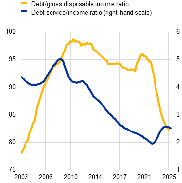 Vulnerabilities in the euro area corporate sector remain elevated as the impact of tariffs unfolds, with potential spillovers to the household sector. Euro area corporate balance sheets have improved in recent years and indebtedness has fallen below levels last observed before the global financial crisis. Nonetheless, profitability remains under pressure from subdued demand, elevated debt service burdens and higher labour costs. Insolvencies have been rising across sectors and countries in light of continued weak and uncertain business prospects (see Box 1). Trade frictions and the recent appreciation of the euro have compounded these pressures, eroding price competitiveness abroad at a time when Chinese firms are increasing their exports to global markets due to weak domestic demand. Tariff-sensitive and export-oriented sectors, such as manufacturing, account for a large share of total value added, credit and employment, implying that shocks affecting these sectors could have broader repercussions (Chart 4, panel a). Although conditions in commercial real estate markets have improved, real estate firms remain highly vulnerable to the ongoing macroeconomic and geopolitical uncertainty given their exposure to both international capital flows and local economic conditions. Euro area households continue to benefit from high savings, rising real wages, resilient labour markets and the marked reduction in the debt-to-GDP ratio which has taken place over recent years (Chart 4, panel b). However, this resilience could be tested if stress in the corporate sector were to push up unemployment or dampen wage growth, potentially weighing on household consumption and debt servicing capacity.