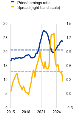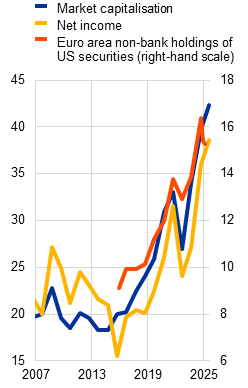Notes: Panel a: “Crypto-assets” refers to the Bloomberg Galaxy Crypto Index which is a benchmark designed to measure the price performance in US dollars of the largest cryptocurrencies. “Global equity markets” refers to the MSCI ACWI index, which measures the performance of large- and mid-cap stocks across both developed and emerging markets worldwide. Panel b: euro area non-bank holdings of US securities are shown as a share of total assets. Panel c: the price/earnings ratio calculation is limited to non-bank holdings within the S&P 500, EURO STOXX 600, Nikkei 225 and FTSE 100 indices, accounting for their changing compositions over time. The metric used is the 12-month forward price/earnings ratio. The spreads are calculated as the difference between an individual security’s yield to maturity and a corresponding benchmark rate. Euro-denominated holdings are benchmarked against the euro area ten-year government benchmark bond yield while US dollar and all other currency holdings are benchmarked against the ten-year US Treasury yield. Each security’s yield is compared with a common ten-year benchmark, regardless of its individual maturity.