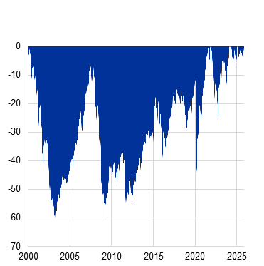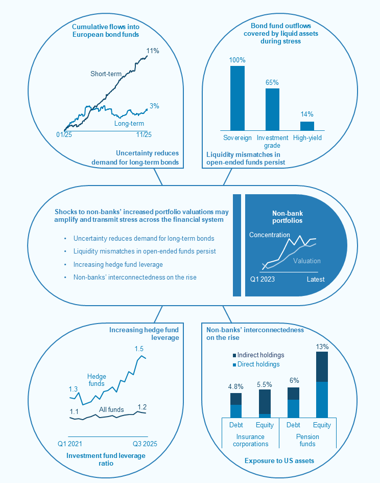 Global stock markets have reached new all-time highs despite recent volatility, while credit spreads are tight by historical standards. Market sentiment could shift abruptly, not only if growth prospects deteriorate but also if technology sector earnings – especially those of companies associated with artificial intelligence – fail to deliver on expectations. Euro area non-bank financial intermediaries would likely suffer losses in such a scenario, due to the size and concentration of their US exposures. Liquidity mismatches of open-ended investment funds, pockets of high leverage among hedge funds and opacity in private markets could amplify market stress.