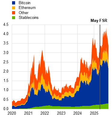 The growing interconnectedness between the crypto-asset ecosystem and traditional finance is opening up new channels of potential contagion, which will require close monitoring. However, the financial stability risks to the euro area currently appear to be limited. See the special feature entitled “Just another crypto boom? Mind the blind spots”, Financial Stability Review, ECB, May 2025.