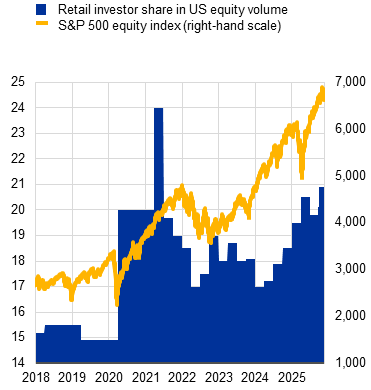US retail stocks (proxied by the Goldman Sachs Retail Favorites Index) and so-called meme stocks (proxied by the UBS Meme Stock Index) have outperformed the broad market since the start of the year by 28% and 24% respectively. Also, the share of zero days to expiration (0DTE) contracts in total S&P 500 option volumes has increased markedly, rising from 15% in January 2019 to reach 61% in October 2025. Retail investors significantly increased their share in these very short-dated contracts, possibly engaging in speculative trading strategies. Cboe estimates that retail investors account for 50-60% of SPX 0DTE trading; see “0DTEs Decoded: Positioning, Trends, and Market Impact”, Cboe, 2 May 2025. In a similar vein, payment for order flow, indicating remuneration for neo-brokers predominantly serving retail clients, has increased in recent years. This further underscores the increasing role of retail activity in market dynamics.