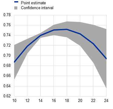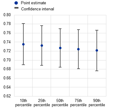 Confidence intervals for all point estimates in Chart 3.1, panel a) overlap almost fully, illustrating that there is no statistically significant relationship between the level of capital requirements and profit efficiency.