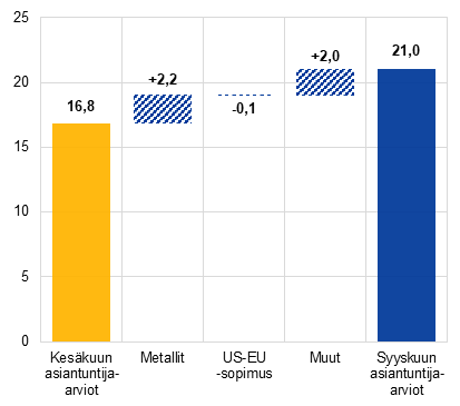 Yhdysvallat on jatkanut tuontitullien korotuksia kesäkuun 2025 asiantuntija-arvioiden koontipäivän jälkeen. Ilmoitus kauppasopimuksista saavutetusta alustavasta yhteisymmärryksestä sekä Yhdysvaltojen ja Kiinan välisen tullisovun jatkuminen ovat kuitenkin vähentäneet kauppapolitiikan epävarmuutta, joka tosin on edelleen voimakasta. Tuontitulleja ja kauppapolitiikan epävarmuutta koskevia perusskenaarion oletuksia tarkastellaan yksityiskohtaisemmin kehikossa 1. Yhdysvaltain hallinto on käynnistänyt kauppalakinsa 232 pykälän nojalla tutkimuksia, jotka koskevat lääkkeiden, puolijohteiden ja puutavaran toimialakohtaisia tuontitulleja. Tutkimukset ovat yhä meneillään, joten tullioletuksiin liittyy yläsuuntaisia riskejä.