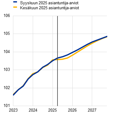 Inflaationäkymät viittaavat siihen, että inflaatio vakautuu 2 prosentin tavoitteen tuntumaan. Yhdenmukaistetulla kuluttajahintaindeksillä (YKHI) mitatun kokonaisinflaation arvioidaan pysyvän noin 2 prosentissa vuoden 2025 loppupuolella, hidastuvan 1,7 prosenttiin vuonna 2026 ja nopeutuvan sitten 1,9 prosenttiin vuonna 2027. Inflaation hidastuminen vuonna 2026 johtuu hintojen vähittäisestä laskusta muissa kuin energiaerässä. Energian hintainflaation odotetaan sen sijaan vaihtelevan edelleen voimakkaasti mutta nopeutuvan arviointijakson kuluessa osin vuonna 2027 käynnistyvän EU:n ETS2-päästökauppajärjestelmän vuoksi. Elintarvikkeiden hintainflaation odotetaan pysyvän aluksi nopeana, kun elintarvikeraaka-aineiden maailmanmarkkinahintojen aiempi nousu välittyy hinnoitteluketjuun viipeellä. Vuosina 2026 ja 2027 elintarvikeinflaation odotetaan kuitenkin maltillistuvan ja asettuvan hieman 2 prosentin yläpuolelle. Energia- ja elintarvikehinnoista puhdistetun YKHI-inflaation odotetaan hidastuvan, kun palkkapaineet heikkenevät ja palvelujen hintainflaatio maltillistuu ja kun euron vahvistuminen välittyy hinnoitteluketjuun hilliten tavaroiden hintainflaatiota. Palkkojen kasvu heikkenee reaalipalkkojen aiemmasta laskusta johtuvien ansionmenetysten kattamisen myötä, ja tuottavuuden kasvu elpyy. Näiden kahden tekijän odotetaan yhdessä hidastavan yksikkötyökustannusten kasvua merkittävästi. Kokonaisinflaatio vuosina 2025 ja 2026 on nyt arvioitu 0,1 prosenttiyksikköä nopeammaksi kuin kesäkuun 2025 asiantuntija-arvioissa, sillä energiaraaka-aineiden hinnat ja hintaoletukset ovat nousseet. Lisäksi hinnoitteluketjuun viipeellä välittyvä elintarvikeraaka-aineiden maailmanmarkkinahintojen nousu vaikuttaa inflaatioon voimakkaammin kuin euron vahvistuminen. Vuonna 2027 vallitsevina ovat euron vahvistumisen viivästyneet vaikutukset, joten inflaatioarviota on tarkistettu 0,1 prosenttiyksikköä alaspäin.