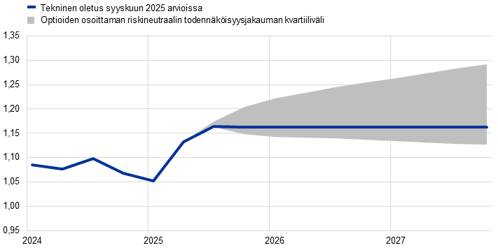 Huom. Indeksin nousu osoittaa euron vahvistumista. Ala- ja yläkvartiilit viittaavat 15.8.2025 päivättyjen Yhdysvaltain dollarin ja euron välisten valuuttakurssioptioiden osoittamiin riskineutraaleihin todennäköisyysjakaumiin. Kokonaistaloudelliset vaikutukset ilmoitetaan EKP:n ja eurojärjestelmän asiantuntija-arvioissa käytettävillä eri makrotalousmalleilla saatujen tulosten keskiarvona.