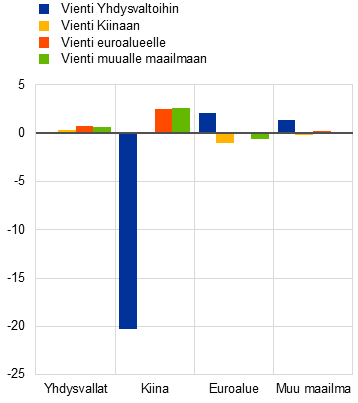 Huom. Kuviossa esitetään kahdenvälisen kaupan muutokset vuoden 2027 viimeisellä neljänneksellä (painottamaton). Kiinan valuuttakurssi on osittain säädelty. ”Muut maat” sisältää Yhdysvaltoja, Kiinaa ja euroaluetta lukuun ottamatta kaikki ECB Global ‑malliin sisältyvät maat, joille on laskettu viennin poikkeamien aritmeettinen keskiarvo perusskenaarioon nähden.