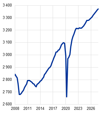 Taloudellinen toimeliaisuus vaihteli voimakkaasti vuoden 2025 alkupuoliskolla ja oli etupainotteista etenkin Irlannissa. Kansainvälisen kaupan tullit ja niihin liittyvä epävarmuus vaikuttivat osaltaan tähän kehitykseen. Niiden vaikutuksen laantuminen vuoden jälkipuoliskolla tuo odotettavasti lisää heilahtelua kasvuun, mikä vaikeuttaa euroalueen talouden pohjavireen tulkintaa. Jos Irlannin talouden toimeliaisuuden vaihtelusta johtuvaa heilahtelua ei oteta lukuun, talouskasvu oli muissa euroalueen maissa vakaampaa, ja sen odotetaan pysyvän vakaana myös vuoden jälkipuoliskolla. Vaikka Yhdysvaltojen ja EU:n uusi kauppasopimus tarkoittaa tullimaksujen korotuksia euroalueelta Yhdysvaltoihin suuntautuvalle viennille, sopimus on auttanut vähentämään kauppapoliittista epävarmuutta. Euroalueen talouskasvun arvioidaankin vahvistuvan myöhemmin arviointijaksolla useiden tekijöiden tuella. Reaalipalkkojen ja työllisyyden kasvu sekä eri valtioiden (pääasiassa Saksan) infrastruktuuri- ja puolustusmenojen lisäykset vahvistanevat euroalueen sisäistä kysyntää. Kasvunäkymien arvioidaan saavan tukea myös ulkoisen kysynnän piristymisestä vuonna 2027 ja rahoitusoloista, joiden rajoittavuutta on vähennetty pääosin taannoisilla rahapoliittisilla päätöksillä. BKT:n keskimääräisen vuotuisen kasvun arvioidaan olevan 1,2 % vuonna 2025 ja 1,0 % vuonna 2026 sekä 1,3 % vuonna 2027. BKT:n kasvunäkymiä vuodelle 2025 on tarkistettu ylöspäin 0,3 prosenttiyksikköä kesäkuussa 2025 julkaistuihin eurojärjestelmän asiantuntija-arvioihin nähden. Syynä ovat odotettua paremmat tuoreet tiedot ja aiempien tietojen tarkistuksista johtuva kasvuperintö. Koska kaikki ennakoidusta poikkeavat tiedot eivät liity taloudellisen toimeliaisuuden vahvempaan etupainotteisuuteen, niiden vaikutuksen arvioidaan tasoittuvan vuoden jälkipuoliskolla vain osittain. BKT:n kasvuarviota vuodelle 2026 on tarkistettu 0,1 prosenttiyksikköä alaspäin, sillä euron kurssi on vahvistunut ja vientikysyntä heikentynyt (osin siksi, että tullimaksut ovat olleet jonkin verran korkeammat kuin mitä kesäkuussa arvioitiin). Vuotta 2027 koskeva arvio on pidetty ennallaan.[1]