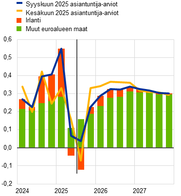 Kesäkuun 2025 asiantuntija-arvioihin verrattuna BKT:n kasvu on nyt arvioitu 0,3 prosenttiyksikköä nopeammaksi vuonna 2025 ja 0,1 prosenttiyksikköä hitaammaksi vuonna 2026. Arvio vuodelle 2027 on entisellään. Vuodelle 2025 laadittua kasvuarviota on korotettu siksi, että edellisen vuoden tietoja on tarkistettu, ja tarkistusten vaikutus ulottuu vuoteen 2025. Lisäksi vuoden 2025 ensimmäiseltä neljännekseltä saadut tiedot ovat olleet huomattavasti odotettua paremmat ja tuoreimmat indikaattorit viittaavat kasvun hienoiseen vahvistumiseen kolmannella neljänneksellä (ks. kuvio 3). Sen sijaan vuotta 2026 koskevaa kasvunäkymää on tarkistettu 0,1 prosenttiyksikköä alaspäin. Tarkistus perustuu arvioon, jonka mukaan tuontitullien korotukset, ulkoisen kysynnän väheneminen ja euron vahvistumiseen liittyvä hintakilpailukyvyn heikkeneminen vaikuttavat taloudelliseen toimeliaisuuteen enemmän kuin luottamuksen koheneminen. Kasvuarvio vuodelle 2027 on pidetty ennallaan. Kysyntäeriin vuoden 2025 osalta tehdyt suurimmat tarkistukset liittyvät investointeihin (yli puolet niistä johtuu henkisen omaisuuden tuotteisiin tehtyjen investointien voimakkaasta vaihtelusta Irlannissa) ja nettovientiin (ks. kuvion 2 kohta b).