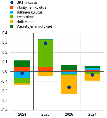 Yksityisen kulutuksen arvioidaan edelleen vauhdittavan BKT:n määrän kasvua. Yksityisen kulutuksen arvioidaan kasvavan vankasti koko arviointijakson ajan ja vaikuttavan eniten BKT:n määrän kasvuun (ks. kuvion 2 kohta a). Lisäksi julkisen kulutuksen ja kokonaisinvestointien ennakoidaan kasvavan joka vuosi vuosina 2025–2027. Vuonna 2027 yksityisten investointien arvioidaan tasoittavan sitä tavanomaista jyrkempää vaikutusta, joka julkisiin investointeihin kohdistuu NGEU-avustusten päättymisen vuoksi. Sen sijaan nettoviennin ennakoidaan vaikuttavan BKT:n kasvuun negatiivisesti vuosina 2025 ja 2026. Tuonnin osuus tästä vaikutuksesta on suurempi (-1,2 prosenttiyksikköä vuonna 2025 ja -0,9 prosenttiyksikköä vuonna 2026) kuin viennin (0,6 prosenttiyksikköä vuonna 2025 ja 0,5 prosenttiyksikköä vuonna 2026). Varastojen muutosten positiivisen vaikutuksen odotetaan kuitenkin osittain tasoittavan nettoviennin negatiivista kasvuvaikutusta vuonna 2025 (ks. kuvion 2 kohta b). Varastojen muutokset vaihtelevat suuresti vuonna 2025, kun niitä ensin kartutetaan viennin etupainotteisuuden vaikutuksesta ja sitten puretaan vaikutuksen laantuessa.