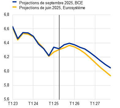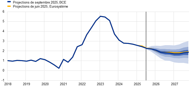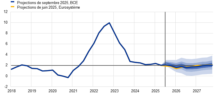 Les perspectives d’inflation sont cohérentes avec une stabilisation de l’inflation autour de l’objectif de 2 % à moyen terme. L’inflation totale, telle que mesurée par l’indice des prix à la consommation harmonisé (IPCH), devrait rester stable, autour de 2 %, pour le reste de 2025, puis diminuer à 1,7 % en 2026 avant de se redresser à 1,9 % en 2027. La baisse en 2026 reflète un nouveau ralentissement progressif des composantes hors énergie, tandis que la hausse des prix de l’énergie devrait rester volatile, mais s’accentuer sur l’horizon de projection, en partie en raison du système d’échange de quotas d’émission de l’UE 2 (SEQE-UE 2), qui démarrera en 2027. L’inflation alimentaire devrait dans un premier temps rester élevée, en raison de la transmission des effets décalés des hausses antérieures des prix des matières premières alimentaires à l’échelle internationale, mais se modérer à des taux légèrement supérieurs à 2 % en 2026 et 2027. L’inflation mesurée par l’IPCH hors énergie et produits alimentaires (IPCHX) devrait ralentir à mesure que les tensions sur les salaires diminuent, que la hausse des prix des services se modère, et que l’appréciation de l’euro se transmet le long de la chaîne des prix et freine le renchérissement des biens. Le ralentissement de la croissance des salaires, les pertes antérieures de salaire réel ayant été compensées, associé à une reprise de la croissance de la productivité, devrait entraîner une nette décélération de la croissance des coûts unitaires de main-d’œuvre. Par rapport aux projections de juin 2025, les perspectives relatives à la hausse de l’IPCH total ont été révisées à la hausse de 0,1 point de pourcentage pour 2025 et 2026 en raison de résultats et d’hypothèses plus élevés concernant les prix des matières premières énergétiques, ainsi que d’effets décalés résultant de l’augmentation des prix des matières premières alimentaires à l’échelle internationale, qui ont plus que compensé l’appréciation de l’euro. Pour 2027, les effets décalés de l’appréciation de l’euro devraient être prédominants, entraînant une révision à la baisse de 0,1 point de pourcentage.