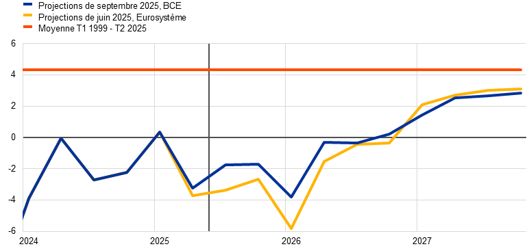 Les droits de douane et l’incertitude qui y est associée ont contribué à de fortes fluctuations de l’activité économique au premier semestre 2025, avec une anticipation de l’activité, en particulier en Irlande. La dissipation de ces facteurs au second semestre de l’année devrait entraîner de nouveaux épisodes de volatilité et brouiller les signaux relatifs à la dynamique sous-jacente de l’économie de la zone euro. Abstraction faite de la volatilité provoquée par les fluctuations des données irlandaises, la croissance économique dans le reste de la zone euro était en fait plus stable, et devrait le rester au second semestre 2025. Si le nouvel accord commercial conclu entre les États-Unis et l’Union européenne (UE) suppose une augmentation des droits de douane sur les exportations de la zone euro aux États-Unis, il a contribué à réduire l’incertitude quant aux politiques commerciales. Plus tard sur l’horizon de projection, la croissance économique de la zone euro devrait se renforcer, soutenue par plusieurs facteurs. La hausse des salaires réels et de l’emploi, conjuguée à de nouvelles dépenses publiques en matière d’infrastructures et de défense, principalement en Allemagne, devrait stimuler la demande intérieure dans la zone euro. En outre, des conditions de financement moins restrictives, reflétant essentiellement les récentes décisions de politique monétaire, et un rebond de la demande extérieure en 2027 soutiendraient également les perspectives de croissance. La croissance annuelle moyenne du PIB en volume devrait s’établir à 1,2 % en 2025, 1,0 % en 2026 et 1,3 % en 2027. Par rapport aux projections macroéconomiques de juin 2025 établies par les services de l’Eurosystème, les perspectives de croissance du PIB ont été révisées à la hausse de 0,3 point de pourcentage pour 2025, traduisant des données meilleures qu’anticipé ainsi qu’un acquis de croissance résultant des révisions des données historiques. Étant donné que les surprises s’agissant des données ne sont pas toutes liées à une anticipation de l’activité plus importante que prévu, elles ne devraient être que partiellement compensées au second semestre de l’année. L’appréciation de l’euro et l’affaiblissement de la demande extérieure (du fait notamment de droits de douane légèrement plus élevés qu’anticipé dans les projections de juin) ont entraîné une révision à la baisse de 0,1 point de pourcentage pour 2026. La projection pour 2027 reste inchangée[1].