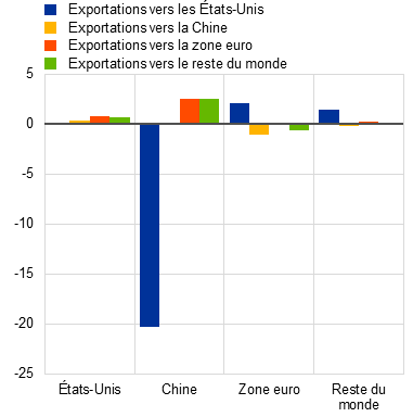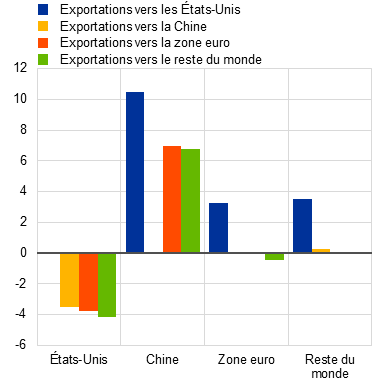 Notes : Le graphique montre les variations (non pondérées) du commerce bilatéral au quatrième trimestre 2027. La Chine dispose d’un taux de change partiellement administré. Le reste du monde est calculé comme la moyenne simple des écarts des exportations par rapport au scénario de référence pour toutes les régions du modèle ECB-Global à l’exclusion des États-Unis, de la Chine et de la zone euro.