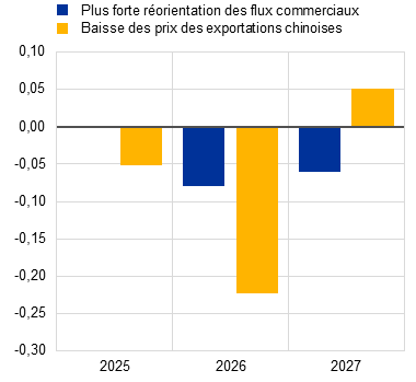 La réaffectation des échanges pourrait être plus importante que dans le scénario de référence et les prix à l’exportation chinois plus faibles. Le modèle ECB-Global suggère que, selon les hypothèses relatives aux droits de douane retenues dans le scénario de référence (comme décrit dans l’encadré 1), la réorientation des échanges au détriment des États-Unis et vers la zone euro est restreinte[13]. Autrement dit, il suppose seulement une faible réaffectation des échanges par les importateurs américains depuis des pays soumis à des droits de douane plus élevés, comme la Chine, vers d’autres pays, et un abaissement limité des prix à l’exportation pratiqués par la Chine pour compenser les droits de douane. Deux scénarios alternatifs sont analysés autour de ce scénario de référence. Dans le premier, les importateurs américains réorientent la demande adressée à la Chine vers la zone euro et le reste du monde. Dans le second, les exportateurs chinois réagissent à l’augmentation des barrières commerciales américaines par une réduction des prix à l’exportation vers tous leurs partenaires commerciaux afin de compenser intégralement les effets de ces barrières sur la totalité de leurs exportations.
