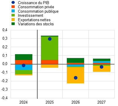 La croissance du PIB en volume devrait continuer d’être tirée par la consommation privée. Du point de vue des dépenses (graphique 2, partie a), la consommation privée progresserait nettement sur l’ensemble de l’horizon, apportant la contribution la plus importante à la croissance du PIB en volume. En outre, la consommation publique et l’investissement total augmenteraient chaque année de 2025 à 2027, l’investissement privé venant compenser le fort effet de falaise attendu sur l’investissement public en 2027 à la suite de l’expiration des subventions accordées au titre du programme NGEU. Les exportations nettes devraient à l’inverse apporter des contributions négatives à la croissance du PIB en volume en 2025 et 2026, la contribution des importations (-1,2 point de pourcentage et ‑0,9 point de pourcentage respectivement) excédant celle des exportations (0,6 point de pourcentage et 0,5 point de pourcentage respectivement) ; cet effet est toutefois partiellement compensé par une contribution positive des variations de stocks en 2025 (graphique 2, partie b). La forte volatilité des variations de stocks tout au long de 2025 est liée à la constitution de stocks et au déstockage, dans le contexte des effets d’anticipation et de leur dissipation progressive.