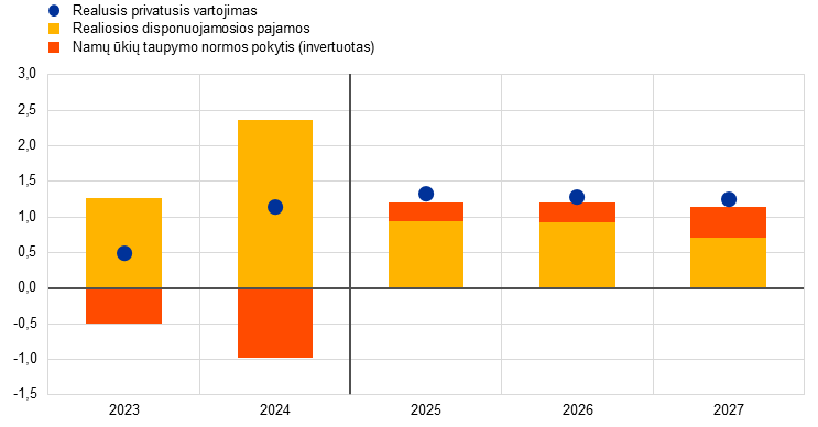 Realiojo BVP augimą ir toliau turėtų skatinti privatusis vartojimas. Kalbant apie išlaidas (žr. 2 pav. a grafiką), numatoma, kad prognozių laikotarpiu privatusis vartojimas sparčiai augs ir bus daugiausiai prie realiojo BVP augimo prisidėsiantis veiksnys. Be to, nuo 2025 iki 2027 m. valdžios sektoriaus vartojimas ir bendros investicijos turėtų kasmet didėti, o numatomą stiprų poveikį, kilsiantį dėl staigaus viešųjų investicijų sumažėjimo 2027 m. pasibaigus finansavimui NGEU dotacijomis, turėtų kompensuoti privačiosios investicijos. Tačiau grynojo eksporto indėlis į realiojo BVP augimą 2025 ir 2026 m. – priešingai – bus neigiamas. Importo indėlis (atitinkamai –1,2 ir –0,9 procentinio punkto) nusveria eksporto indėlį (atitinkamai 0,6 ir 0,5 procentinio punkto), tačiau tai iš dalies atsveria teigiamas atsargų pokyčio indėlis 2025 m. (žr. 2 pav. b grafiką). Labai didelis atsargų svyravimas 2025 m. susijęs su atsargų kaupimu ir mažinimu, kurį skatino prekybos paankstinimas ir vėlesnis šio paankstinimo poveikio sumažėjimas.
