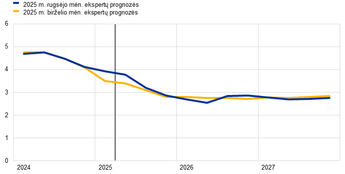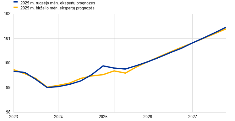 Infliacijos perspektyva atitinka infliacijos stabilizavimosi ties vidutinio laikotarpio tiksliniu 2 % lygiu prognozę. Numatoma, kad bendroji infliacija, vertinama pagal suderintą vartotojų kainų indeksą (SVKI), artimiausiu laikotarpiu iš esmės nesikeis ir kitą 2025 m. dalį bus apie 2 %, bet 2026 m. sumažės iki 1,7 %, o 2027 m. vėl padidės iki 1,9 %. Sumažėjimas 2026 m. susijęs su toliau laipsniškai švelnėjančiomis ne energetikos dedamosiomis, o energijos kainų kilimas turėtų toliau būti nepastovus, bet prognozių laikotarpiu padidėti iš dalies dėl to, kad 2027 m. pradės veikti naujoji ES apyvartinių taršos leidimų prekybos sistema (ATLPS2). Numatoma, kad iš pradžių maisto produktų kainos toliau kils dėl uždelsto anksčiau kilusių tarptautinių maisto žaliavų kainų poveikio, bet 2026 ir 2027 m. kilimas sumažės ir bus šiek tiek didesnis nei 2 %. Infliacija pagal SVKI, neįskaitant energijos ir maisto produktų, turėtų sumažėti, nes slopsta spaudimas darbo užmokesčiui ir lėtėja paslaugų kainų kilimas, o euro pabrangimas veikia kainų nustatymo grandinę ir varžo prekių kainų kilimą. Numatoma, kad, lėčiau kylant darbo užmokesčiui, nes jau kompensuotas ankstesnis realiojo darbo užmokesčio mažėjimas, ir kartu atsigaunant našumui, gerokai lėčiau didės vienetinės darbo sąnaudos. Palyginti su 2025 m. birželio mėn. prognozėmis, bendrosios infliacijos pagal SVKI prognozė 2025 ir 2026 m. padidinta 0,1 procentinio punkto dėl didesnių numatomų energijos žaliavų kainų bei prielaidų, taip pat dėl uždelsto didesnių tarptautinių maisto žaliavų kainų poveikio, kuris su kaupu atsveria euro pabrangimą. Numatoma, kad visus 2027 m. bus juntamas uždelstas euro pabrangimo poveikis, todėl tų metų prognozė sumažinta 0,1 procentinio punkto.