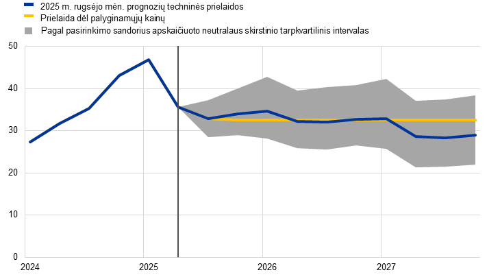 Pastabos: lygių korekcijos išreikštos procentais, o augimo tempų – procentiniais punktais ir procentais per metus. Augimo tempų ir palūkanų normų korekcijos apskaičiuotos remiantis vienos dešimtosios tikslumu suapvalintais skaičiais, o procentais išreikštos korekcijos apskaičiuotos remiantis nesuapvalintais skaičiais. Techninės prielaidos dėl euro zonos palūkanų normų ir žaliavų kainų grindžiamos rinkos lūkesčiais (galutinė duomenų įtraukimo data – 2025 m. rugpjūčio 15 d.). Naftos kainos – tai „Brent“ žalios naftos neatidėliotinų sandorių ir ateities sandorių kainos. Dujų kainos – tai Nyderlandų TTF dujų neatidėliotinų sandorių ir ateities sandorių kainos. Elektros energijos kainos – tai penkių didžiausių euro zonos šalių vidutinės didmeninės neatidėliotinų sandorių ir ateities sandorių kainos. ES ATLPS1 apyvartinių taršos leidimų „sintetinė“ ateities sandorių kaina nustatoma kaip dviejų artimiausių Europos energijos biržos apyvartinių taršos leidimų ateities sandorių linijiniu būdu interpoliuota mėnesio pabaigos vertė. Tada apskaičiuojamas apyvartinių taršos leidimų ateities sandorių kainų mėnesio vidurkis kaip metinio dažnio ekvivalentas. Jeigu prasmingų prekybos ATLPS2 leidimais duomenų neturima, ekspertai prielaidas dėl kainos nustatė pagal mažiausią kainą, kurią viršijus būtų išleisti papildomi apyvartiniai taršos leidimai, ir tą kainą atnaujino pagal 2027 m. kainas (daugiau apie tai – 2024 m. gruodžio mėn. Eurosistemos ekspertų prognozių 2 intarpe „Su klimato kaita susijusių pertvarkų politikos poveikio augimui ir infliacijai vertinimas“). Žaliavų kainų raida įvertinama pagal dešimties darbo dienų laikotarpio iki galutinės duomenų įtraukimo dienos ateities sandorių rinkas. Dvišaliai valiutos kursai prognozių laikotarpiu greičiausiai nesikeis ir bus tokie, kokie vidutiniškai buvo dešimt darbo dienų iki galutinės duomenų įtraukimo dienos. Prielaidos dėl euro zonos 10 m. vyriausybės obligacijų nominaliojo pajamingumo grindžiamos šalių 10 m. obligacijų pajamingumo svertiniu vidurkiu, svorius apskaičiuojant pagal metinius BVP duomenis. Kai turima reikiamų duomenų, konkrečios šalies 10 m. vyriausybės obligacijų nominalusis pajamingumas apibrėžiamas kaip 10 m. lyginamųjų obligacijų pajamingumas, pratęstas naudojant išankstinių sandorių nominalųjį pajamingumą, kuris išvedamas iš atitinkamų konkrečios šalies paskutinės duomenų įtraukimo dienos pajamingumo kreivių. Kitų šalių 10 m. vyriausybės obligacijų pajamingumas apibrėžiamas kaip 10 m. lyginamųjų obligacijų pajamingumas, pratęstas techninėms prielaidoms dėl euro zonos nerizikingų ilgalaikių palūkanų normų pritaikius pastovią (paskutinės duomenų įtraukimo dienos) maržą.