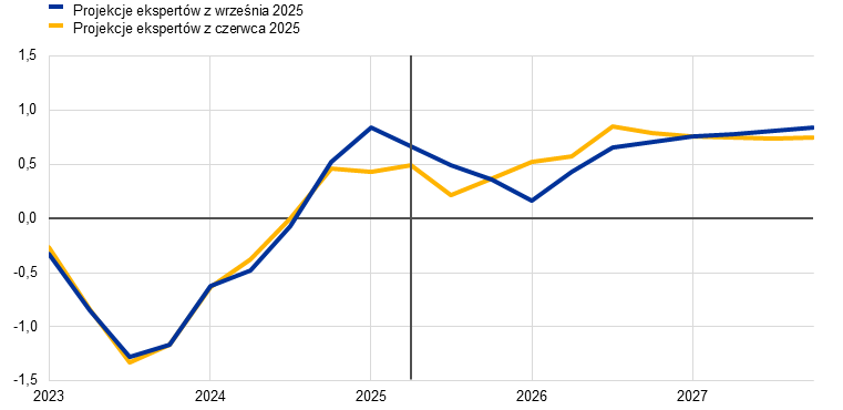 Aktywność gospodarcza w pierwszej połowie 2025 mocno się wahała z powodu ceł handlowych i związanej z nimi niepewności, przy czym początkowo przyspieszyła, zwłaszcza w Irlandii. Ustępowanie tych czynników w drugim półroczu według oczekiwań będzie powodować dalszą zmienność, przez co sygnały dotyczące dynamiki wzrostu gospodarczego w strefie euro staną się mniej jasne. Gdy pominie się zmienność spowodowaną wahaniami danych dla Irlandii, w rzeczywistości wzrost gospodarczy w pozostałej części strefy euro był stabilniejszy i według oczekiwań tak pozostanie w drugiej połowie roku. Nowa umowa handlowa między USA a UE oznacza wprawdzie wyższe cła na eksport ze strefy euro do Stanów Zjednoczonych, ale pomogła zmniejszyć niepewność co do polityki handlowej. W dalszej części horyzontu projekcji wzrost gospodarczy w strefie euro ma się zwiększyć, pod wpływem kilku czynników. Popyt wewnętrzny w strefie euro powinny wzmacniać rosnące płace realne i zatrudnienie oraz nowe wydatki publiczne na infrastrukturę i obronność, głównie w Niemczech. Ponadto na perspektywy wzrostu gospodarczego korzystnie wpływają mniej restrykcyjne warunki finansowania, wynikające głównie z ostatnich decyzji w sprawie polityki pieniężnej, oraz odbicie popytu zewnętrznego w 2027. Przewiduje się, że średnioroczna dynamika realnego PKB wyniesie 1,2% w 2025, 1,0% w 2026 i 1,3% w 2027. W porównaniu z projekcjami makroekonomicznymi ekspertów Eurosystemu z czerwca 2025 perspektywy wzrostu PKB na 2025 zrewidowano w górę o 0,3 pkt proc. Odzwierciedla to lepsze, niż oczekiwano, napływające dane i efekt przeniesienia wynikający z rewizji wcześniejszych danych. Ponieważ nie wszystkie zaskakujące dane są związane z silniejszym, niż wcześniej zakładano, początkowym przyspieszeniem aktywności, są one jedynie częściowo kompensowane w drugim półroczu. Aprecjacja euro i słabszy popyt zewnętrzny (wynikający po części z nieco wyższych, niż zakładano w projekcjach czerwcowych, stawek celnych) doprowadziły do rewizji w dół o 0,1 pkt proc. projekcji realnego PKB na 2026. Projekcja na 2027 pozostaje bez zmian[1].