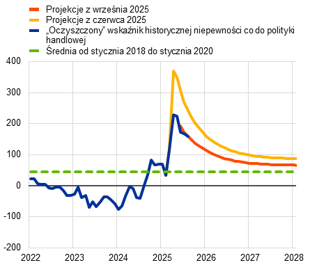 - Na podstawie „nieskorygowanego” wskaźnika niepewności dotyczącej polityki handlowej, który „oczyszcza się”, żeby wykluczyć szacowany wpływ uwagi poświęconej przez media niepewności niezwiązanej z polityką handlową, efektywnymi stawkami celnymi, warunkami finansowymi ani presją w łańcuchach dostaw. Założenia przedstawione na wykresie B w ramce 2 pt. „Amerykańskie cła i niepewność co do polityki handlowej” w projekcjach z czerwca 2025 odnosiły się do nieskorygowanego wskaźnika niepewności dotyczącej polityki handlowej, natomiast w części a) wykresu B w ramce 1 przedstawiono „oczyszczony” wskaźnik.