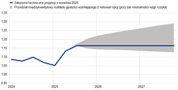 Uwagi: Wzrost oznacza aprecjację euro. 25. percentyl i 75. percentyl odnoszą się do rozkładu gęstości kursu USD/EUR wynikającego z notowań opcji (przy założeniu neutralności względem ryzyka) na 15 sierpnia 2025. Skutki makroekonomiczne podaje się jako średnie wyników uzyskanych z różnych modeli makroekonomicznych stosowanych przez ekspertów EBC i Eurosystemu.