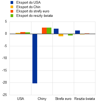 Uwagi: Wykres przedstawia (nieważone) zmiany w handlu dwustronnym w czwartym kwartale 2027. Chiny mają częściowo sterowany kurs walutowy. Wartości dla „reszty świata” obliczono jako średnią arytmetyczną odchylenia eksportu poszczególnych regionów od scenariusza bazowego w modelu ECB‑Global, z wyłączeniem Stanów Zjednoczonych, Chin i strefy euro.