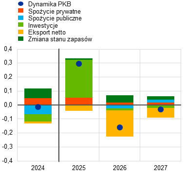 Motorem wzrostu realnego PKB powinno pozostać spożycie prywatne. W ujęciu wydatkowym (wykres 2, część a) spożycie prywatne ma w całym horyzoncie projekcji mocno rosnąć i mieć największą kontrybucję do dynamiki realnego PKB. Ponadto spożycie publiczne i inwestycje ogółem powinny w 2025−2027 co roku notować wzrost. Inwestycje prywatne mają skompensować oczekiwany nagły i ostry spadek inwestycji publicznych w 2027, wynikający z wygaśnięcia finansowania z dotacji NGEU. Z kolei eksport netto według projekcji wpłynie na zmniejszenie się dynamiki realnego PKB w 2025 i 2026 – przy czym kontrybucja importu będzie większa (odpowiednio −1,2 pkt proc. i −0,9 pkt proc.) niż eksportu (odpowiednio 0,6 pkt proc. i 0,5 pkt proc.) – ale będzie to częściowo niwelowane przez dodatnią kontrybucję zmian stanu zapasów w 2025 (wykres 2, część b). Duża zmienność tego ostatniego czynnika w 2025 jest związana z gromadzeniem i zmniejszaniem zapasów w kontekście przyspieszenia aktywności i zanikania jego wpływu.