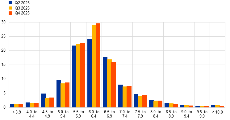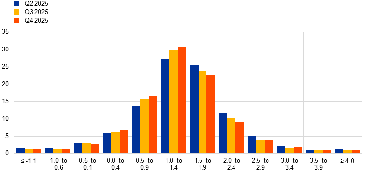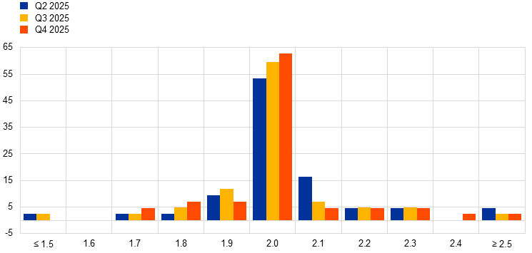Longer-term inflation expectations were unchanged at 2.0%, and more respondents saw headline inflation at 2.0% in 2030 (see Chart 3). The modal and median values of the distribution of individual point forecasts were both unchanged at 2.0%, and the shape of the cross-sectional distribution was also largely unaltered (Chart 4).[5] The majority of respondents continue to see inflation at the 2% target in the longer term: for the eighth consecutive round, more than half of the respondents reported longer-term inflation expectations of 2.0% (63% in this round, compared with 60% in the previous round). Compared to the previous round, the histogram of individual point forecasts was largely similar, with around three-quarters of participants reporting expectations between 1.9% and 2.1%, while 14% reported values above this range and 12% below.