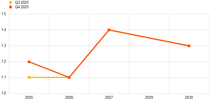 GDP growth expectations stood at 1.2% for 2025, 1.1% for 2026 and 1.4% for 2027 (Chart 6). Compared with the previous round, these figures imply a slight upward revision of 0.1 percentage points for 2025, while the outlook for 2026 and 2027 remained broadly unchanged. The figure for 2025 is in line with the September 2025 ECB staff macroeconomic projections, while the figures for 2026 and 2027 are both 0.1 percentage points higher. The longer-term growth expectations (referring to 2030) were unchanged at 1.3%.